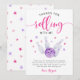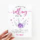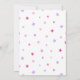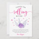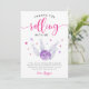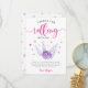 Cartão de agradecimento de festa de aniversário de menina com tema de boliche fofo com ilustração de aquarela de uma bola de boliche atingindo alguns pinos com estrelas rosa e roxas ao redor. O texto diz "obrigado por rolar comigo".