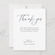 Cartões de agradecimento de casamento simples e elegantes com acentos de escrita em azul-marinho profundo em um fundo branco, juntamente com sua mensagem de agradecimento impressa personalizada e seus nomes. Alternativamente, você pode deixar a seção da mensagem de agradecimento em branco se desejar escrever à mão uma nota personalizada em cada cartão após recebê-los. O verso apresenta ondas abstratas de aquarela em tons costeiros de azul e turquesa e um monograma do casal com uma ilustração de cavalo-marinho e concha e as iniciais do casal no centro. Perfeito para casamentos na praia e com tema náutico. Arte por KL Stock