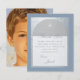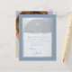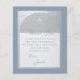 Um convite moderno para a primeira comunhão. Em um fundo retangular azul poeirento, há um arco de folha de prata falsa que contém texto azul poeirento em fundo branco. As palavras "Obrigado" e o nome são escritos em uma fonte caligráfica elegante; o resto em letras maiúsculas.