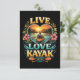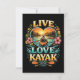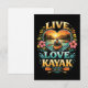 A serene heart-shaped lakeside scene celebrates the love of kayaking amid mountains, flowers, and golden sunset skies.