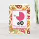 Um cartões de agradecimentos com uma ilustração de carruagem de bebê rosa-quente sobre um fundo cor-de-rosa, verde, dourado, laranja e paisley burgundy. Dentro é vazio.