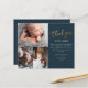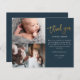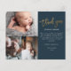 Este cartão de agradecimento para bebê com colagem de 3 fotos e roteiro econômico apresenta agradecimento moderno com caligrafia manuscrita em dourado e mensagem pessoal na frente. Clique no botão personalizar para personalizar este design com suas fotos e detalhes.