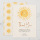 Este cartão de agradecimento para chá de bebê temático solar apresenta um sol amarelo sorridente e uma tipografia de roteiro elegante em um fundo creme. A parte de trás é decorada com um padrão de sol. Fácilmente personalizável. Aquarela Original © Michele Davies.