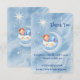 Expresse gratidão sincera com este cartão de agradecimento de chá de bebê sonhador, apresentando um bebê tranquilo dormindo sobre uma nuvem sorridente sob uma lua crescente brilhante. O céu noturno suave em aquarela, repleto de estrelas delicadas, cria uma atmosfera mágica e suave, perfeita para celebrar a chegada de um pequeno. Ideal para chás de bebê para meninos, celebrações de recém-nascidos e eventos de bebê com tema celestial. Este charmoso design adiciona um toque caloroso e memorável ao agradecer amigos e familiares por seu amor e presentes.