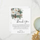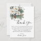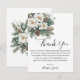 Cartão de agradecimento para chá de noiva de inverno Snow In Love com folhas verdes de inverno, flores brancas e um pouco de neve para capturar o tema de inverno