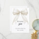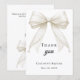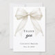 Um cartão de agradecimento de Batismo moderno e elegante. Um fundo branco, decorado com um grande laço cor de marfim com pérolas. Na frente, o texto: Obrigado, nome e data.