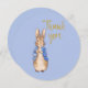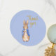 Peter em um fundo azul com o texto "Obrigado" em dourado.