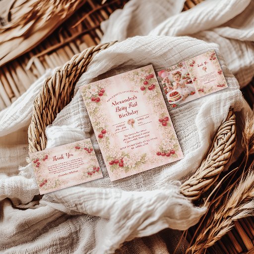 Cartão De Agradecimento Photo Sweet Cherry Floral First Birthday 1st Birth