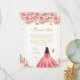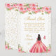 This elegant and glamorous sweet sixteen thank you card features a beautiful princess with dark hair and dark skin in a pink ball gown. The text combines handwritten script and modern sans serif fonts for a classy and sophisticated look. The floral arrangements, butterflies and gold confetti create the perfect blend of rustic and chic.
