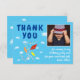 Pipas Nuvens Azul Crianças Foto Aniversário Cartão de Agradecimento. Design fofo com três pipas em cores vermelha, amarela e laranja. As pipas estão voando no céu entre as nuvens. Adicione seu texto, nome e foto e faça um cartão de aniversário personalizado fofo para um menino ou uma menina.