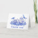 Este cartões de agradecimentos tem um design monocromático com um conjunto de chá azul e branco rodeado de pássaros e flores.