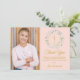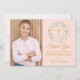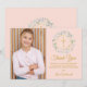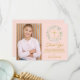 Uma grinalda de louro decorativa, anéis dourados e um crucifixo ficam acima da sua mensagem especial de agradecimento da primeira comunhão e ao lado da sua própria foto em um fundo rosa bege. O verso apresenta uma grinalda de louro correspondente, anéis dourados e crucifixo. Desenhado por Thisisnotme