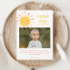 Um cartão de agradecimento de aniversário de primeira viagem ao redor do sol infantil com sol fofo e design moderno. Clique no botão de edição para personalizar este design com seus detalhes.
