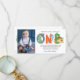 Cartões de agradecimentos de primeiro aniversário moderno, simples e elegante. Design com o script Dino um, obrigado sua mensagem e uma foto. Perfeito como um obrigado que você fez para o Dinossauro temeu a primeira festa de aniversário.