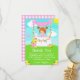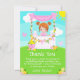 Este simpático e caprichoso cartão de agradecimento apresenta uma menina de cabelo ruivo e pele clara em um quiosque de limonada rosa decorado com flores e bandeirolas. Ao fundo, um céu azul, sol e borboletas. O texto combina fontes decorativas e sem serifa para um visual moderno e elegante. É perfeito para uma festa de aniversário de verão.