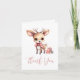 Cartões de agradecimentos com uma ilustração de um adorável veado bebê. Olhos grandes orelhas com cabeça grande e pequenos galhos castanhos. Vestindo um grande arco vermelho. Ao lado de uma pilha de presentes.