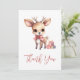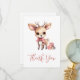 Cartões de agradecimentos com uma ilustração de um adorável veado bebê. Olhos grandes orelhas com cabeça grande e pequenos galhos castanhos. Vestindo um grande arco vermelho. Ao lado de uma pilha de presentes.