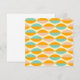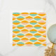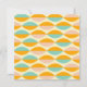 Repeating geometric pattern with overlapping leaf shapes in orange, teal, and pink on a beige background. The design conveys a retro, vibrant feel.