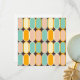 Retro geometric pattern with overlapping vertical ovals in shades of teal, peach, orange, and cream on a dark brown background. Vibrant and symmetrical.