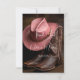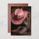 Uma imagem lindamente composta que captura a essência de um casamento no campo, apresentando um par de botas de cowboy marrom finamente detalhadas, combinadas com um chapéu de cowboy de cor rosa suave. Contra um fundo de couro áspero; também uma textura de couro no verso do cartão, a cena evoca charme, tradição e elegância ocidental—perfeita para a noiva ou o noivo moderno que traz um pouco de charme country para o seu grande dia.