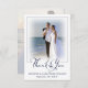 Envie ao obrigado de casamento pré-impresso mensagens ou notas de apreciação manuscritas com estas fotografias náuticas, cartões de agradecimento com duas fotos (uma de cada lado) e um título moderno de tipografia manuscrita, acentuado com uma âncora em azul e branco marinho. ASSISTÊNCIA: para obter assistência com modificações ou personalização do design, transferir o design para outro produto ou coordenar itens, entre em contato com o designer ANTES DE PEDIR por meio do Zazzle Chat ou makeitaboutyoustore@gmail.com.