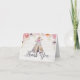 Cartões de agradecimentos bóquico com flores aquáticas, árvore, penas e fontes de script sobre fundo de madeira. Perfeito para chá de fraldas ou festa de aniversário.