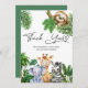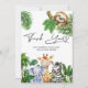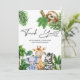 Expresse sua gratidão com estilo com este encantador cartão de agradecimento temático de safari. Com um bicho-preguiça brincalhão, uma girafa adorável, zebra e elefante cercados por verde tropical exuberante, este cartão é a maneira perfeita de agradecer aos seus convidados por tornar o chá de bebê ainda mais especial. A fonte elegante manuscrita adiciona um toque sincero a este charmoso design.