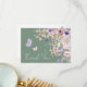 Este cartão de agradecimento plano foi projetado para combinar com o tema doce e caprichoso "Um pequeno borboleta está a caminho". A frente apresenta um fundo verde suave e uma fonte branca para um visual fresco e elegante. Flores silvestres e folhagens em aquarela acentuam o design, com borboletas rosa e roxas pairando em torno das palavras "Obrigado" em uma caligrafia elegante e manuscrita. A paleta de cores suaves de tons rosa, rosa poeirado, lilás, lavanda, violeta e verdes frescos combina perfeitamente com o fundo verde.