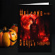 Bem-vindos ao Playground do diabo. Horror Halloween - Perfeito para adultos, homens mulheres mulheres adolescentes adolescentes - Diabo ou Satã encarando um cemitério à noite com lua vermelha de sangue. Assustador e assustador monstro ou demônio andando em um cemitério pelo Halloween com pedras de cascalho ou tombaria e jack-o-lanternas. Olhos brilhantes e chifres grandes.