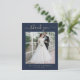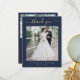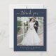 Elegante, na moda e simples obrigado de casamento, seu cartão com fotos 2 com roteiro dourado em um lindo fundo azul. Design apresenta um obrigado elegante que você escreve com foto editável, nome da noiva e noiva com data de casamento na frente da carta. A parte traseira da placa apresenta uma segunda foto e mensagem editáveis. Fácil de personalizar texto e fotos. Pegue o seu hoje!