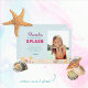 Celebre sua pequena sereia com este cartão de agradecimento de festa de aniversário infantil ilustrado com uma sereia desenhada à mão e uma cena de praia. Este convite tem um verso personalizável que inclui uma seção para detalhes da festa e uma foto da criança aniversariante. Variações nos recursos físicos da sereia disponíveis!