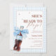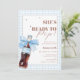 Celebrate your baby shower with this “She Is Ready to Pop” invitation featuring a charming soda pop illustration, soft blue tones, gingham background, and coquette bow details. Perfect for a preppy and playful baby shower theme, this invitation sets the tone for a coordinated and stylish celebration. Designed to match a full baby shower collection.