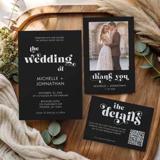 This simple, modern minimalist thank you wedding card features a modern serif font, and add your own photo. Add your first names in this elegant template along with the date and location for a simple, classy invitation. Add a thank you message on the back.