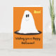 Este pequeno fantasma está sorrindo para você mesmo como diz Boo! A ilustração é um fantasma branco sobre fundo laranja, posicionado na forma de disco preto para contraste. Mensagem na frente: Desejando um Feliz Dia das Bruxas! dentro de vazio de para mensagens personalizadas, que podem ser escritas à mão ou personalizadas no check-out.