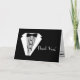 Este design clássico apresenta um Smoking preto e branco com gravata borboleta preta em um fundo preto, com as palavras "Obrigado". Personalize este cartão de agradecimento clicando em "Personalize-o" e siga as instruções fáceis de usar! DICA: ao projetar, permaneça dentro das linhas tracejadas vermelhas! O texto precisa ser pequeno. Compre produtos coordenados. Por favor, visite minha loja "The Hungarican Princess" em www.zazzle.com/hungaricanprincess*. Procure no meu Departamento de "Casamento" ou na coleção "Presentes de Agradecimento para Padrinhos".