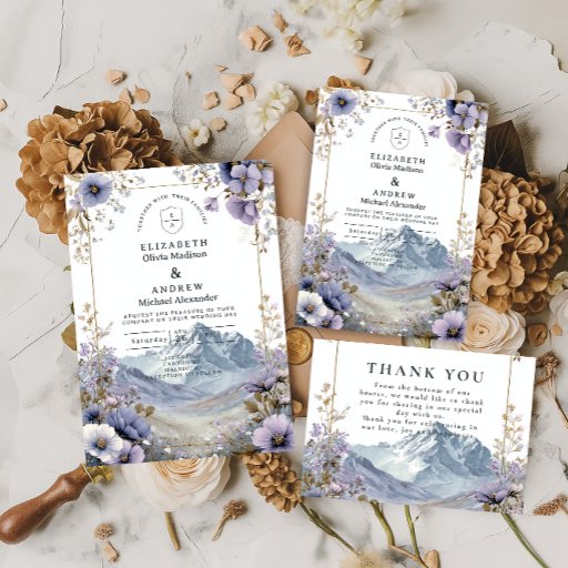 A soft, romantic wedding design inspired by airy mountain landscapes and delicate wildflowers in muted lavender, sage, and ivory tones. The light, painterly composition creates a calm and elegant atmosphere, perfect for nature-inspired, outdoor, or destination weddings with a timeless botanical aesthetic.