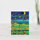Estrelas amarelas brilhando no céu ecoam borboletas amarelas dançando em um campo. Listras violetas e azuis no céu combinam faixas de grama verde no campo. Esta imagem alegre une visualmente os céus e a terra.