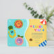 Diga obrigado de forma espalhafatosa com este colorido cartão de agradecimento de festa na piscina Bumble Nums! Com Humble em um flutuador de melancia, Stumble em um aro de abacaxi com óculos de sol e Grumble em um flutuador estilo donut, a cena é ambientada em uma piscina brilhante e cenário de praia com guarda-sol, bola de praia e estrelas-do-mar. Um título ousado e divertido "OBRIGADO!" aparece ao lado de uma mensagem sincera, personalizável com o nome do seu filho. Perfeito para enviar agradecimentos após uma festa de aniversário divertida com tema de verão com os Bumble Nums!