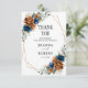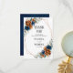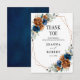 Elegante cartão de agradecimento de casamento com tema floral terroso laranja, azul marinho, apresentando um buquê elegante de rosas azul marinho, peônias cor de terracota e folhas de eucalipto verde. Por favor, entre em contato comigo para qualquer ajuda na personalização ou se você precisar de qualquer outro produto com este design.