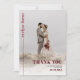 Este elegante cartão de casamento mostra um belo design Japandi. O design é minimalista, mas cativante, com uma linha vertical no lado esquerdo que se estende em direção à parte superior da placa com os nomes do casal, criando uma sensação de continuidade. O cartão inclui também uma fotografia adorável do casal feliz e a data do seu dia especial, fazer-o como uma marca personalizada. Na parte de trás do cartão, aparece uma mensagem sincera de "Obrigado", expressando gratidão.
