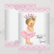 Cartão de agradecimento de chá de bebê menina com fundo de renda rosa e adorável bebê vintage menina usando tutu rosa, sapatos rosa, coroa chique e laço rosa no cabelo. Este cartão de agradecimento de bebê estilo flat rosa é facilmente personalizado adicionando sua mensagem no estilo de fonte, tamanho e cor da fonte, e a palavra de sua escolha, ou deixe em branco para adicionar sua mensagem manuscrita após chegarem. Você também pode alterar a cor do fundo.