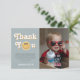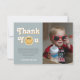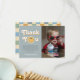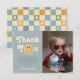 Este cartão de agradecimento de 1º aniversário dos meninos captura a vibração retrô dos anos 70 com um tema de sorriso azul fofo e um padrão xadrez azul pastel no verso. Totalmente personalizável, inclui espaço para sua mensagem, foto e nome. Perfeito para um aniversário boho "One Cool Dude".
