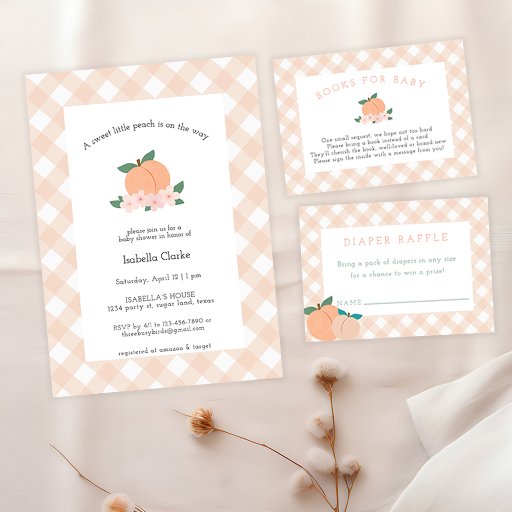Ajude a construir uma biblioteca para o pequeno pêssego! Como parte do nosso pacote de convites temático de pêssego, este cartão de livros para receptáculo de bebê convida-o a contribuir para a coleção crescente do bebê. Simplesmente traga um livro infantil favorito em vez de uma carta para o chá de fraldas, e insira uma mensagem de amor dentro. Seu dom pensado será apreciado por anos, enquanto o pequeno embarca em inúmeras aventuras através das páginas desses livros especiais. O vamos rodeia o bebê com histórias e imaginação desde o início. Obrigado por fazer parte desta doce celebração!