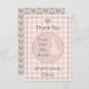 Um adorável cartão de agradecimento de 1º aniversário rosa xadrez da One Silly Goose para meninas. Ele apresenta uma ilustração em aquarela de um ganso branco fofo com uma borda rosa xadrez e corações em patchwork. Você pode alterar as fontes/cores — design rosa, branco e cinza.