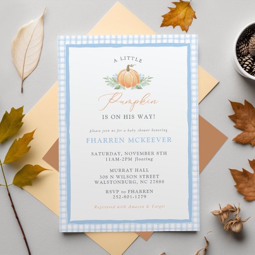 Celebre seu pequeno com charme de eterno usando este convite de chá de fraldas "A Little Pumpkin Is On the Way". Apresentando uma abóbora de aquarela pintada à mão, sotaques de gingham macios e tipografia elegante, esta design combina encanto rústico com sofisticação clássica. Perfeito para as comemorações do outono, este convite pode ser personalizado para dizer "a caminho" ou "a caminho dela", fazer que seja uma escolha versátil para qualquer chá de fraldas.