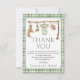 Este cartão de agradecimento de chá de bebê com tema de caça é uma forma sincera de expressar sua gratidão após uma celebração rústica ou inspirada na floresta. Com ilustrações suaves em aquarela, tons verdes quentes e uma borda clássica de gingham, ele cria um design atemporal e significativo.