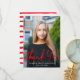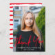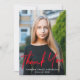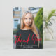 Cartões de agradecimentos de graduação moderno com a foto do formando com "Obrigado" em letra vermelha de script de pincel. Personalize a frente do cartões de agradecimentos de graduação de fotos adicionando o nome do formando e o ano de graduação. A parte traseira da placa apresenta espaço para o seu obrigado datilografado ou manuscrito com um fundo listrado vermelho e branco.