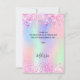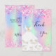 Um cartão de agradecimento de aniversário feminino e elegante. Uma cor de fundo holográfica em rosa, roxo e verde menta. Com confetes rosa e um vestido branco. Na frente, grande letra manuscrita e o texto: Obrigado.