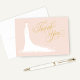 Cartões de agradecimento elegantes para chuveiro de noiva ou casamento "Obrigado" para a noiva estilosa que será apresenta uma fonte de letra de caligrafia ornamentada e um vestido de noiva fluindo. Detalhes de floreio, flor e borboleta acentuam o vestido etéreo. O formato de cartão dobrado inclui espaço no interior para uma mensagem manuscrita. As cores do design incluem tons de rosa bege pálido, branco e dourado
