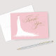 Cartões de agradecimento elegantes para chá de panela ou casamento para a noiva elegante apresentam uma fonte de caligrafia ornamentada e um vestido de noiva fluindo. Detalhes de floreio, flor e borboleta acentuam o vestido etéreo. O formato de cartão dobrado inclui espaço no interior para uma mensagem manuscrita. As cores do design incluem branco, rosa doce claro e dourado antigo.
